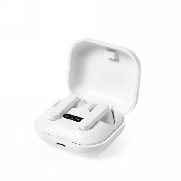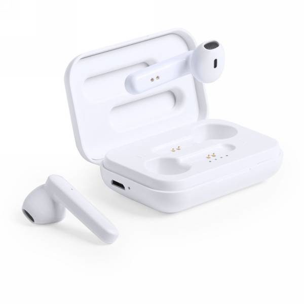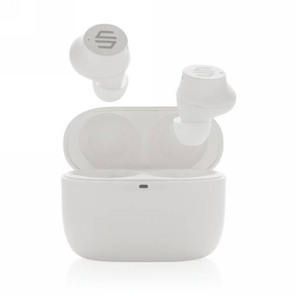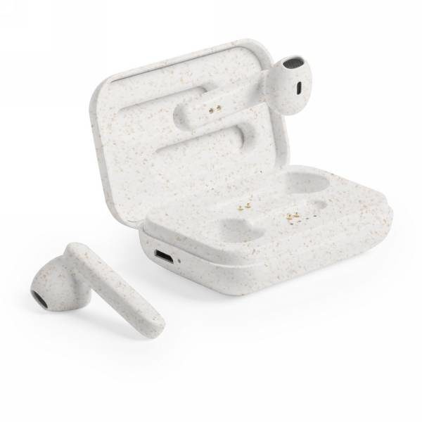 Bezprzewodowe słuchawki douszne TWS (True Wireless Stereo), BT 5.0, wykonane z ABS pochodzącego z recyklingu, posiadają certyfikat RCS (Recycled Claim Standard), który jest stosowany gdy produkt jest wykonany częściowo lub w całości z materiałów pochodzących z recyklingu, funkcja odbierania połączeń, etui z wbudowanym akumulatorem 300 mAh pełniące funkcję stacji ładującej w komplecie, akumulator słuchawek o pojemności 40 mAh umożliwia odtwarzanie muzyki do 4 godzin, ponowne naładowanie za pomocą etui w 1,5 godziny, zasięg do 10 metrów, kabel wykonany z TPE z recyklingu bez dodatku PVC w komplecie, nie zawiera PVC