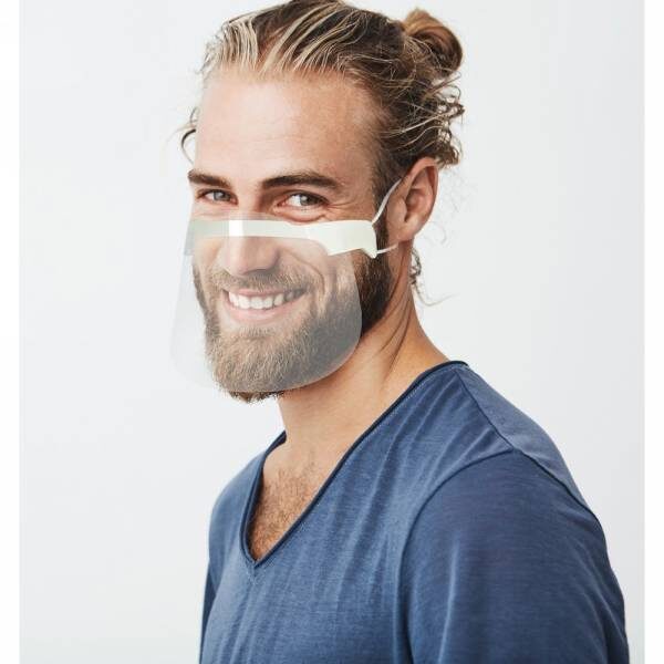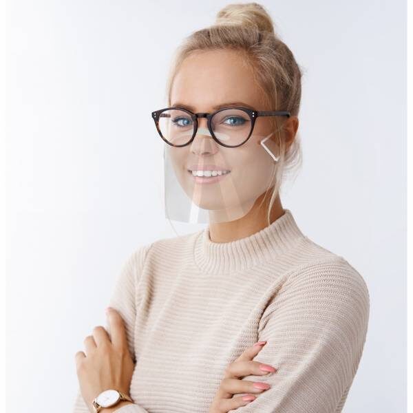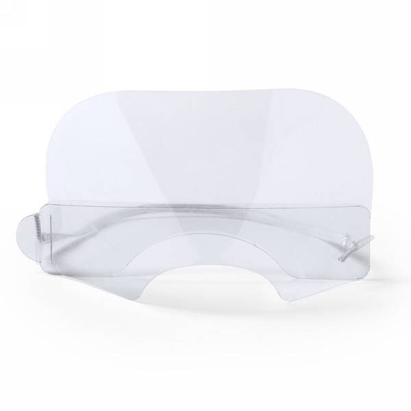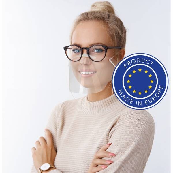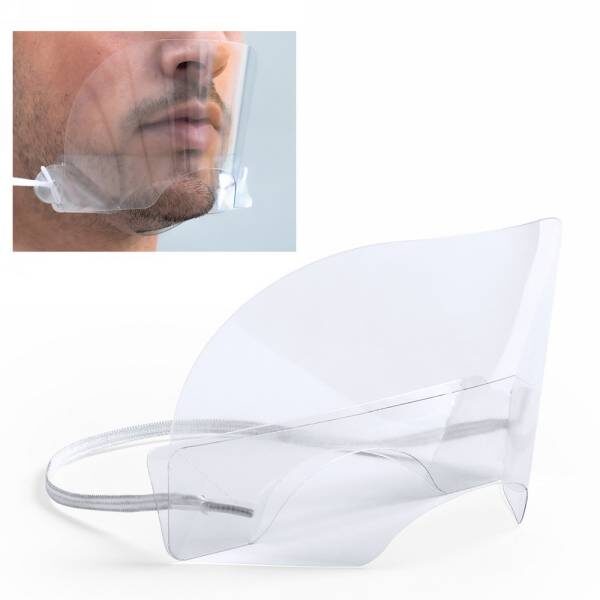 Osłona na nos i usta z elastycznymi mocowaniami, wielokrotnego użytku, wykonana z przezroczystego tworzywa PET, łatwa do dezynfekcji po każdym użyciu, łatwa w montażu, możliwość dopasowania długości gumek, duże otwory umożliwiające łatwą wymianę gumek, odpowiednio wyprofilowana pod okulary, posiada otwory zapobiegające parowaniu okularów, szeroki nosek z pianki poliestrowej dla większego komfortu użytkowania (wyprodukowana w Europie / made in Europe)