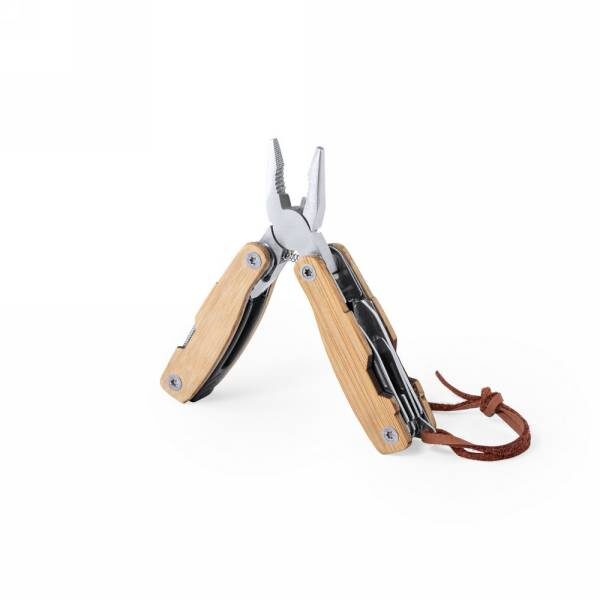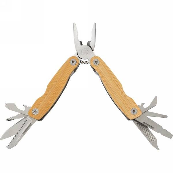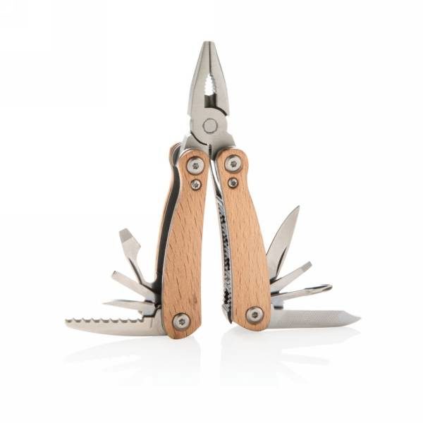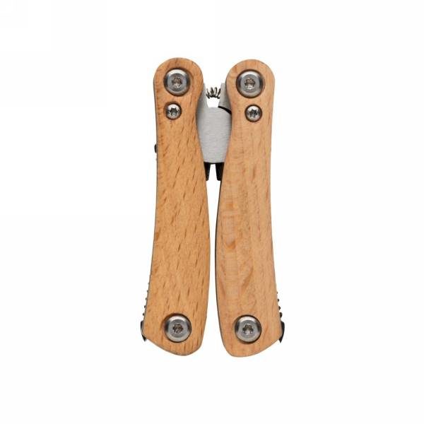 Trwałe i kompaktowe narzędzie wielofunkcyjne, wykonane z wysokiej jakości stali nierdzewnej, uchwyt z drewna bukowego, 12 funkcji: długie szczypce, kombinerki, przecinak do kabli i drutu, ostrze ząbkowane, mały nóż, średni śrubokręt płaski, otwieracz do butelek, duży śrubokręt płaski, nóż, mały śrubokręt płaski, śrubokręt krzyżakowy, pilnik i skrobak, w ozdobnym pudełku