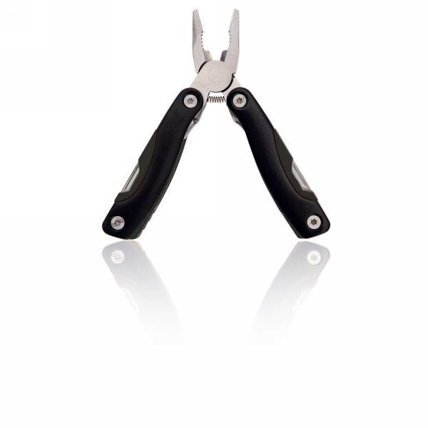 Bardzo wytrzymałe narzędzie wielofunkcyjne z zestawem 9 bitów, wykonane ze stali nierdzewnej, aluminiowy uchwyt, 10 funkcji: długie szczypce, kombinerki, przecinak do drutu i kabli, nóż, ostrze ząbkowane, otwieracz do puszek, otwieracz do butelek, śrubokręt płaski, adapter wkrętaka i zestaw końcówek wkrętakowych 9 w 1, etui z wysokiej jakości poliestru 1680D w komplecie, w ozdobnym pudełku