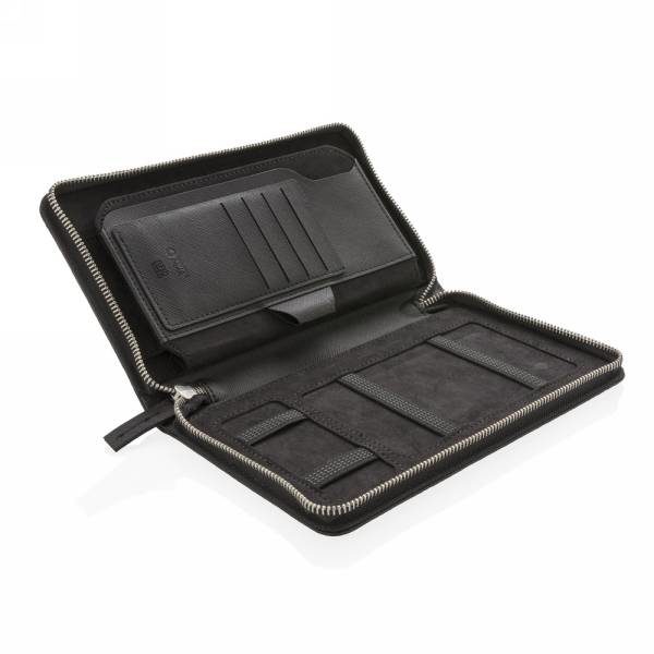 Portfel z ochroną RFID, etui na 4 karty kredytowe, miejsca na bilety, paszport, pieniądze, telefon komórkowy itp., uchwyt na długopis, wykonany z PU z recyklingu z certyfikatem RCS (Recycled Claim Standard) który gwarantuje, że wykorzystane materiały pochodzą z recyklingu, całkowita zawartość materiału z recyklingu obliczona w oparciu o wagę całkowitą przedmiotu: 36,24%, nie zawiera PVC