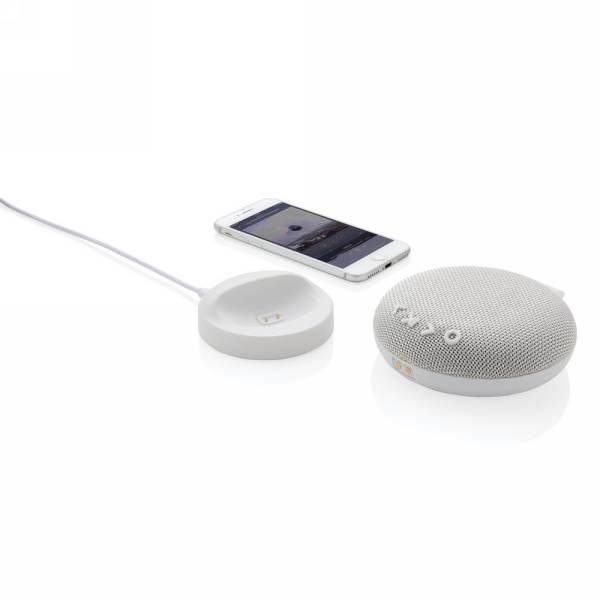 Głośnik bezprzewodowy 5W, wodoodporny (IPX6), wbudowany akumulator o pojemności 1200 mAh umożliwia odtwarzanie muzyki do 8 godzin, ponowne naładowanie w 5 godzin, głośnik ładowany bezprzewodowo po umieszczeniu na stacji ładującej, stacja ładująca posiada wyjście USB do ładowania za pomocą kabla, wejście stacji ładującej 5V/1A, wyjście USB 5V/1A, kabel micro USB 120 cm wykonany z TPE bez dodatku PVC w komplecie