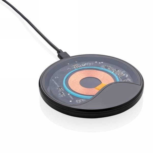 Ładowarka bezprzewodowa szybkiego ładowania 10W, transparentna obudowa ukazująca komponenty klasy A+, wewnątrz wysokiej jakości cewka, niebieskie światło LED, dzięki dużej mocy szybkość ładowania bezprzewodowego jest dwukrotnie większa niż w większości ładowarek bezprzewodowych dostępnych na rynku, bezprzewodowe ładowanie jest kompatybilne ze wszystkimi urządzeniami posiadającymi możliwość ładowania indukcyjnego, wejście 5V/2A, wyjście bezprzewodowe 9V/1.1 10W, kabel USB typu C 150 cm w komplecie, wzór zastrzeżony®
