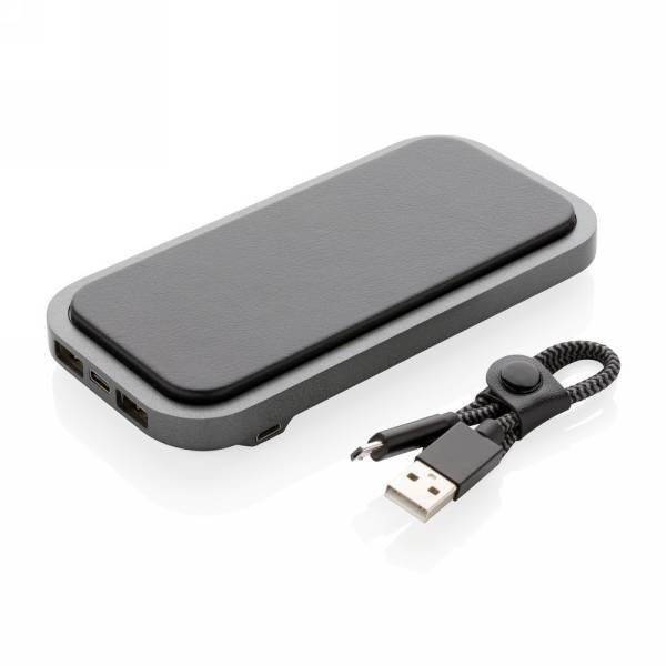 Bezprzewodowy power bank 10000 mAh, ładowarka bezprzewodowa 5W, 4 diody wskazujące poziom naładowania, wykonany z wysokiej jakości PU i ABS, w pełni naładowany wbudowany akumulator litowo-polimerowy klasy A o dużej gęstości i trwałości pozwala naładować telefon do 5 razy, 2 porty USB do ładowania 2 urządzeń jednocześnie, możliwość ładowania kablem i bezprzewodowo, bezprzewodowe ładowanie jest kompatybilne ze wszystkimi urządzeniami posiadającymi możliwość ładowania indukcyjnego, wejście micro USB 5V/2A, wejście typu C 5V/2A, wyjście USB 5V/2.1A, wyjście bezprzewodowe 5V/1A 5W, nylonowy kabel micro USB w komplecie, w ozdobnym pudełku