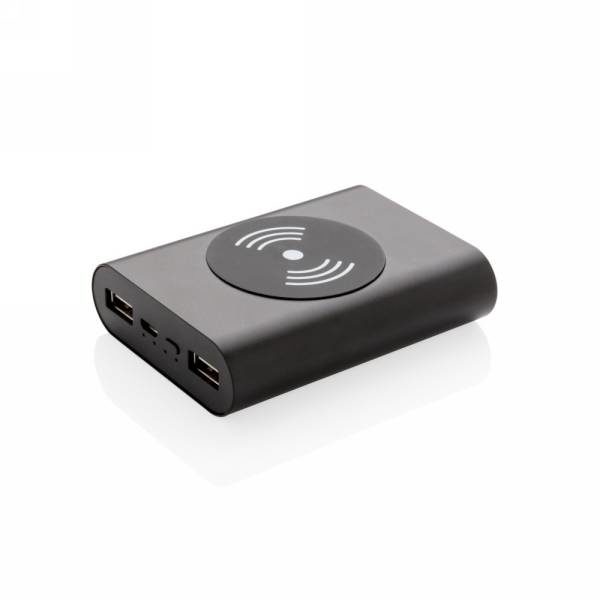 Bezprzewodowy power bank 4000 mAh, ładowarka bezprzewodowa 5W, 5 diod wskazujących poziom naładowania, wyposażony w przycisk włączania/wyłączania, wykonany z aluminium, wbudowany akumulator litowo-polimerowy wysokiej jakości, możliwość ładowania kablem i bezprzewodowo, bezprzewodowe ładowanie jest kompatybilne ze wszystkimi urządzeniami posiadającymi możliwość ładowania indukcyjnego, wyjście 5V/2.1A, wejście 5V/1.5A, wyjście bezprzewodowe 5W, kabel micro USB w komplecie