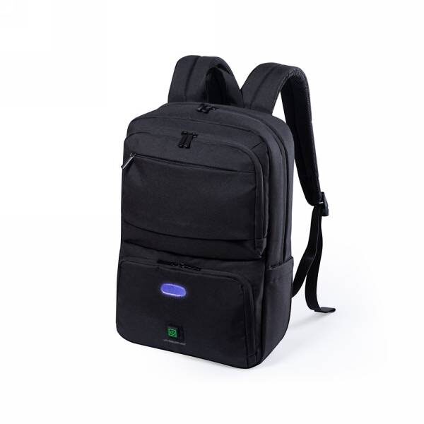 Plecak na laptopa 15,6" z kieszenią sterylizującą UV-C, zintegrowana kieszeń sterylizująca zabija 99,9% bakterii na umieszczonych wewnątrz przedmiotach takich jak zegarki, telefony, słuchawki, biżuteria, itp., 3 minutowy tryb sterylizacji, dzięki specjalnej konstrukcji po otwarciu urządzenia w trakcie sterylizacji światło wyłączy się automatycznie bez narażania użytkownika, podwójne zamknięcie na zamek błyskawiczny i magnes, wnętrze z poliestru 210D, na zewnątrz poliestry 600D i 900D, kieszenie wewnątrz i na zewnątrz, w komplecie kabel micro USB do ładowania sterylizatora, zgodny z normą EN62471, nie zawiera PVC