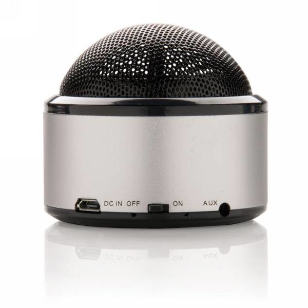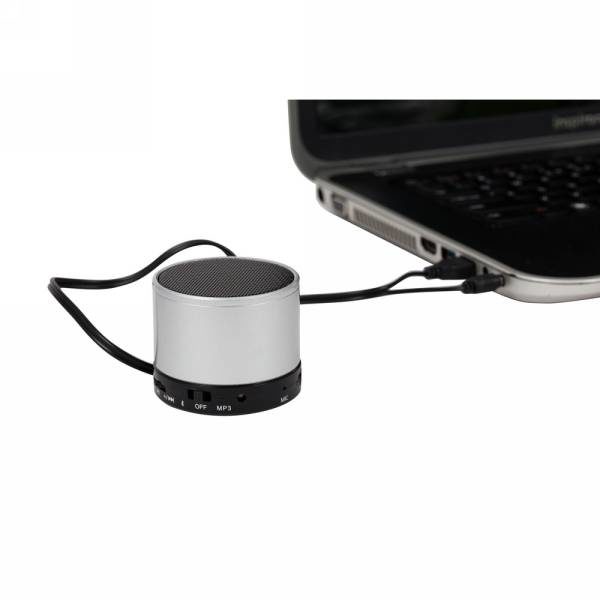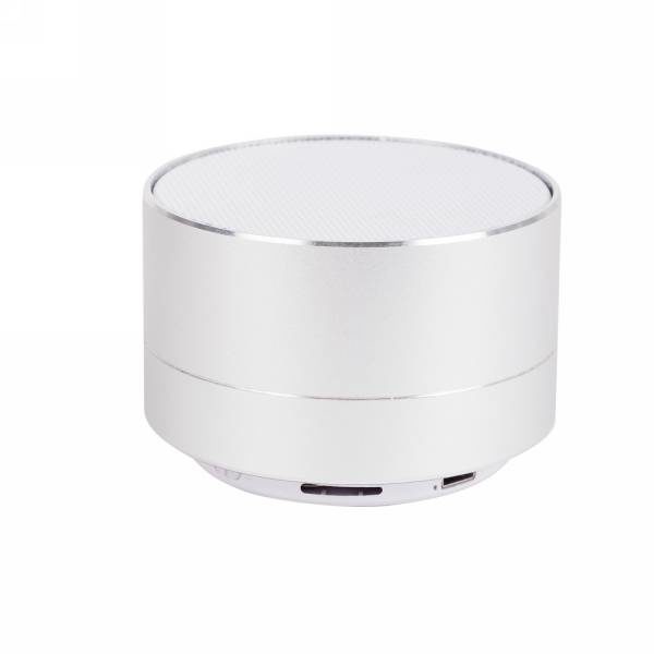 Głośnik bezprzewodowy 3W, wykonany z aluminium, metalowa maskownica, gumowe paski na spodzie poprawiają przyczepność i jakość dźwięku, specjalna konstrukcja głośnika zapewnia rozchodzenie się dźwięku we wszystkich kierunkach, w pełni naładowany akumulator o pojemności 350 mAh pozwala na odtwarzanie muzyki do 3 godzin, zasięg do 10 m, kabel micro USB do ładowania oraz kabel audio w komplecie, kompatybilny ze wszystkimi telefonami