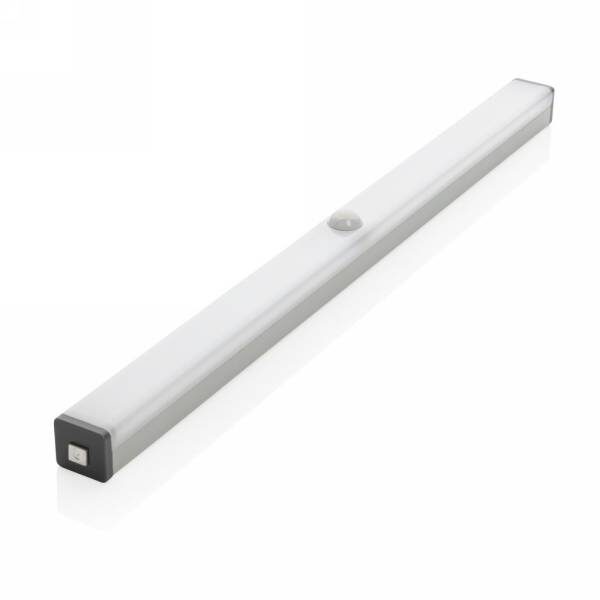 Lampka LED z czujnikiem ruchu, średnia, 10 diod LED, magnes z tyłu do przytwierdzenia do metalowych powierzchni, 2 magnesy z naklejką do przytwierdzenia do niemetalicznych powierzchni w komplecie, dwa tryby pracy: świecenie ciągłe oraz włączane automatycznie za pomocą czujnika ruchu, dioda włącza się po wykryciu ruchu i wyłącza się 35 sekund po ostatnim wykrytym ruchu, zasięg roboczy czujnika do 3m, wbudowany akumulator 500 mAh pozwala na ciągłe świecenie do 4,5 godziny, ładowanie za pomocą dołączonego kabla micro USB