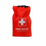 Apteczka Air Gifts w wodoodpornym pokrowcu z karabińczykiem, główna przegroda zamykana na klamrę zatrzaskową, wewnątrz: bandaż elastyczny 7,5 cm x 4,5 m, bandaż elastyczny 5 cm x 4,5 m, maseczka do resuscytacji, rękawice winylowe, płatki nasączone alkoholem 6 szt., chusteczki antyseptyczne 4 szt., okłady po użądleniu 4 szt., koc ratunkowy, chusta trójkątna, sterylne gaziki 2″x2″ 2 szt., sterylne gaziki 3″x3″ 2 szt., plastry 72x19mm 10 szt., plastry „H” 4 szt., guma uciskowa, nożyczki, pinceta, gwizdek, taśma klejąca i 4 agrafki