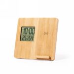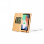 Bambusowa bezprzewodowa ładowarka 10W, stacja pogodowa, zegar, termometr, higrometr, stojak na telefon, działa z telefonami posiadającymi możliwość ładowania indukcyjnego, zegar zasilany bateriami, kabel micro USB w komplecie