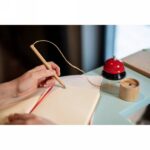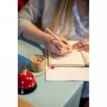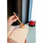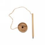 Bambusowy długopis ze stojakiem B’RIGHT, mocowanie na taśmę, długopis połączony ze stojakiem naturalnym sznurkiem (33 cm)
