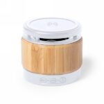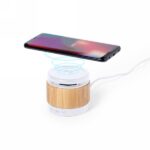 Głośnik bezprzewodowy BT 5.0 3W, ładowarka bezprzewodowa 5W, działa z telefonami posiadającymi możliwość ładowania indukcyjnego, 400 mAh, bambusowy element na zewnątrz, zasięg do 10 m, wejście micro USB, ładowany przez USB, kabel micro USB w komplecie
