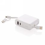 Bezprzewodowy power bank 5000 mAh z przyssawkami, ładowarka bezprzewodowa 5W, wbudowany akumulator litowo-polimerowy klasy A, zintegrowany kabel: 3 w 1 i do ładowania (iOS/Android/USB A), bezprzewodowe ładowanie jest kompatybilne ze wszystkimi urządzeniami posiadającymi możliwość ładowania indukcyjnego, wejście USB 5V/2A, wejście typu C 5V/2A, wyjście USB 5V/2.1A, wyjście bezprzewodowe 5V/1A, kabel micro USB w komplecie