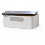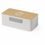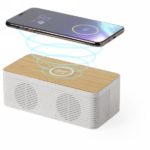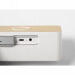 Głośnik bezprzewodowy BT 5.0 5W z włókien słomy pszenicznej, bambusowy detal, ładowarka bezprzewodowa 10W z funkcją szybkiego ładowania, działa z telefonami posiadającymi możliwość ładowania indukcyjnego, bateria 1200 mAh, posiada funkcję odbierania połączeń, wbudowany mikrofon, zasięg do 10 m, ładowany przez USB, kabel USB typu w komplecie