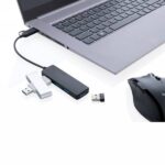 Hub USB, 3 porty USB 2.0, 1 port USB typu C, kabel wejściowy 8,5 cm z końcówkami USB i USB typu C, obudowa wykonana w 100% z ABS z recyklingu, kabel z TPE pochodzącego w 100% z recyklingu, kabel i obudowa posiadają certyfikat RCS (Recycled Claim Standard) który gwarantuje, że wykorzystane materiały pochodzą z recyklingu, w pudełku z certyfikatem FSC® mix, nie zawiera PVC