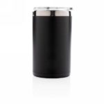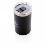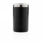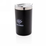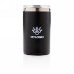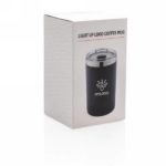 Kubek podróżny 225 ml, podwójne ścianki, wnętrze ze stali nierdzewnej 304, ABS na zewnątrz, grawer ukazuje podświetlaną powierzchnię, efekt podświetlenia logotypu przy potrząśnięciu kubkiem, pasuje do większości ekspresów do kawy, 2 baterie CR2032 w komplecie