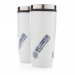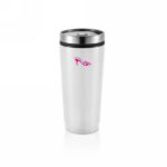 Kubek podróżny 370 ml, stal nierdzewna na zewnątrz, wnętrze z PP, pokrętka na pokrywie i przycisk zamykający zapobiegający wylaniu, nie wymaga obsługi oburącz, szczelny, nie zawiera BPA