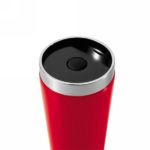 Kubek podróżny 370 ml, stal nierdzewna na zewnątrz, wnętrze z PP, pokrętka na pokrywie i przycisk zamykający zapobiegający wylaniu, nie wymaga obsługi oburącz, szczelny, nie zawiera BPA