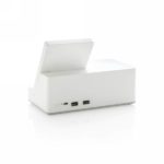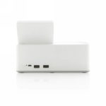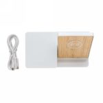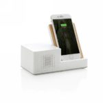 Ładowarka bezprzewodowa 5W, głośnik bezprzewodowy 3W, BT 4.1, stojak na telefon, wykonana z naturalnego bambusa i ABS, możliwość ładowania bezprzewodowo i za pomocą kabla, podczas korzystania z obu funkcji zaleca się podłączenie urządzenia do źródła zasilania, bezprzewodowe ładowanie jest kompatybilne ze wszystkimi urządzeniami posiadającymi możliwość ładowania indukcyjnego, zasięg głośnika do 10 m, 2 wyjścia USB 5V/1A max, kabel micro USB 150 cm w komplecie, wzór zastrzeżony®
