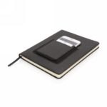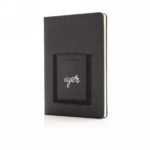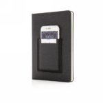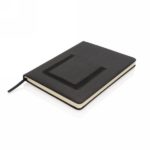 Notatnik A5 (80 kremowych kartek 78 g/m2), posiada kieszeń na telefon i miejsce na kartę kredytową, tasiemka zakładkowa