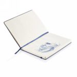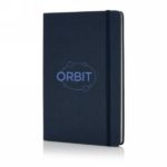 Notatnik A5 (80 kartek 80 g/m2 w linie), twarda okładka z PU doskonale nadaje się do tłoczenia, tasiemka zakładkowa i elastyczna opaska do zamykania