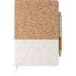 Notatnik (ok. A5, 80 kartek w linie), okładka wykonana z korka i płótna, tasiemka zakładkowa, długopis ze słomy pszenicznej w komplecie, w pudełku