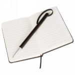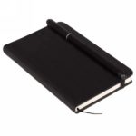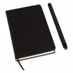 Notatnik (ok. A6, 96 kartek w linie), twarda okładka, tasiemka zakładkowa oraz długopis, touch pen z zatyczką na gumce, którą można przyczepić do notatnika