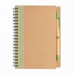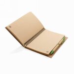 Notatnik (70 kremowych kartek z papieru makulaturowego 70 g/m2 w linie), spiralne bindowanie, dopasowany kolorystycznie długopis z papieru kraftowego w komplecie, niemiecki wkład Dokumental® w kolorze niebieskim w komplecie, długość pisania ok. 600 m