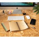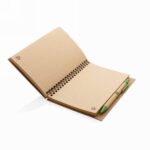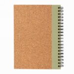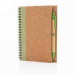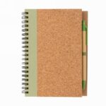 Notatnik (70 kremowych kartek z papieru makulaturowego 70 g/m2 w linie), korkowa okładka, spiralne bindowanie, dopasowany kolorystycznie długopis z papieru kraftowego w komplecie, niemiecki wkład Dokumental® w kolorze niebieskim w komplecie, długość pisania ok. 600 m