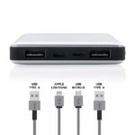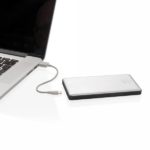 Power bank 10000 mAh, 4 diody wskazujące poziom naładowania, wykonany z aluminium, wbudowany wytrzymały akumulator litowo-polimerowy, 2 wejścia do ładowania (micro USB, iOS), użytkownicy iOS mogą używać tego samego kabla (nie dołączony) zarówno do ładowania telefonu, jak i do ładowania power banku, nadaje się do ładowania telefonów i tabletów, wyjście DC 5V/2.4A, wejście 5V/2A, kabel micro USB w komplecie