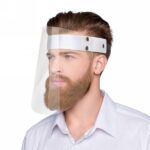 Osłona na twarz z możliwością regulacji obwodu, wielokrotnego użytku, osłona czołowa z miękką gąbką z przodu dla większego komfortu użytkowania, przezroczysta część wykonana z przezroczystego tworzywa PET o wymiarach 30 x 24 cm odpornego na środki dezynfekujące na bazie alkoholu oraz inne substancje myjące, wyprodukowana w Polsce
