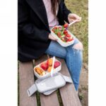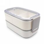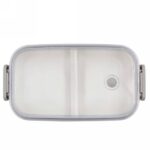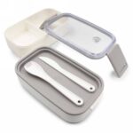 Pudełka śniadaniowe 2 szt., 2×700 ml, szczelne, zamykane na 2 klipsy, w komplecie nóż i łyżkowidelec, górne pudełko z wyjmowaną przegrodą i przezroczystym wieczkiem