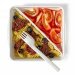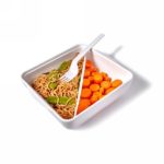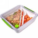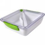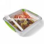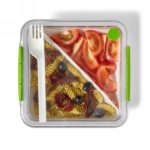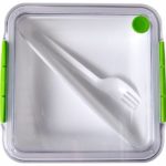 Pudełko śniadaniowe 920 ml, przezroczyste wieczko z silikonowym zamknięciem, trójkątna przegroda oraz widelec w komplecie