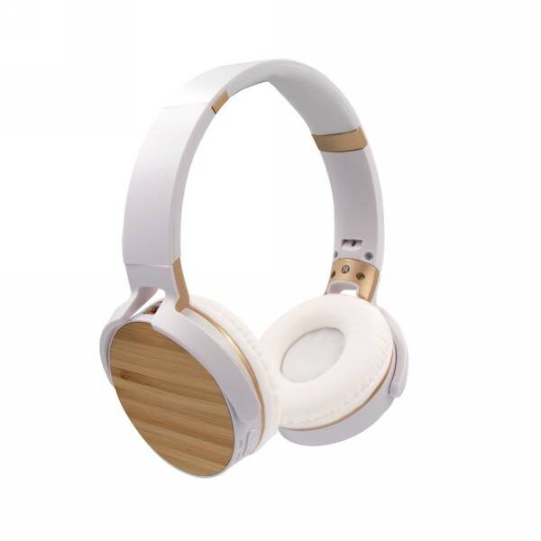 Nauszne słuchawki bezprzewodowe BT 5.0, bambusowe elementy, składane, bateria 200 mAh, czas pracy: 6-8 godzin, czas ładowania: 1-2 godzin, funkcja odbierania połączeń oraz czytnik kart TF (nie dołączona), wbudowany mikrofon, wejście audio, zasięg do 10 m, ładowane przez USB, kabel micro USB w komplecie