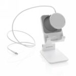 Stojak na telefon, tablet, wykonany z ABS, regulowana wysokość, silikonowy element chroniący przed zarysowaniem w którym można umieścić ładowarkę Magsafe, ciężka podstawa i silikonowe paski zapewniają stabilność