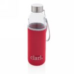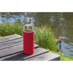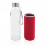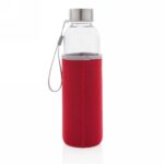 Szklana butelka sportowa 500 ml w pokrowcu, pokrowiec z neoprenu, szczelne wieczko ze stali nierdzewnej, uchwyt, nadaje się wyłącznie do zimnej wody, nie zawiera BPA