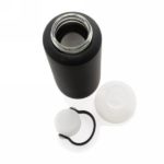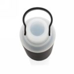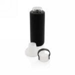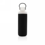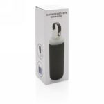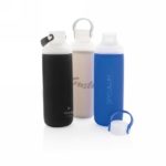 Butelka sportowa 500 ml, silikonowy pokrowiec chroni przed uszkodzeniem i stanowi warstwę izolacji chroniącej przed oparzeniem, szczelne wieczko z uchwytem oraz dwoma otworami do picia (szeroki i wąski), wykonana z wytrzymałego szkła borokrzemowego odpornego na wysokie temperatury i nadającego się w 100% do recyklingu, nie zawiera BPA, ftalanów, PVC, ołowiu i kadmu