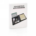 Teczka konferencyjna z notatnikiem A4 (w linie, zadruk jednostronny), power bank 4000 mAh, stojak na telefon lub tablet, wewnątrz kieszeń na telefon z transparentnym okienkiem oraz uchwyty na akcesoria, wyjście 5V/2.1A, wejście 5V/0.8A, kabel micro USB w komplecie