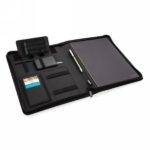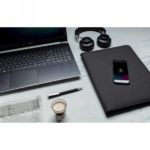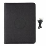 Teczka konferencyjna z notatnikiem A4 (20 kremowych kartek 70 g/m2 w linie), okładka wykonana z przyjaznego środowisku materiału rPET, bezprzewodowy power bank 5000 mAh, ładowarka bezprzewodowa 5W na przedniej okładce, 2 wyjścia USB do ładowania za pomocą kabla, bezprzewodowe ładowanie jest kompatybilne ze wszystkimi urządzeniami posiadającymi możliwość ładowania indukcyjnego, wejście 5V/2.1A, wyjście 1: 5V/2.1A, wyjście 2: 5V/2.1A, wyjście bezprzewodowe 5W, wzór zastrzeżony®