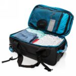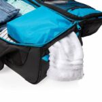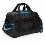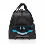 Torba podróżna, walizka na kółkach z wysuwaną rączką, wykonana z wytrzymałego poliestru i PU, przestronna przegroda główna o pojemności 84 l z siateczkową kieszenią, z przodu i na górze kieszenie na zamek błyskawiczny, paski do noszenia w pozycji pionowej w komplecie