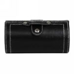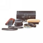 Zestaw do konserwacji obuwia w opakowaniu z imitacji skóry, zawiera drewnianą szczotkę do butów, neutralną pastę do czyszczenia, miękką tkaninę do polerowania na błysk, łyżkę do butów oraz parę czarnych sznurowadeł
