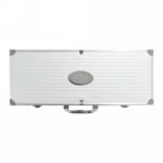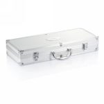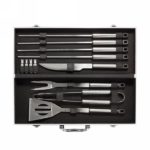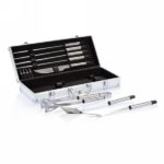 Zestaw akcesoriów do grilla ze stali nierdzewnej, 12 el., w komplecie: 4 szpikulce, nóż do krojenia, 4 sztućce do kukurydzy, szpatułka, widelec z pokrywą ochronną i para szczypiec, czarne uchwyty ze stali nierdzewnej, w aluminiowym pudełku z uchwytem