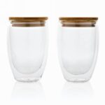 Zestaw szklanek 350 ml, 2 szt., bambusowe wieczko, podwójne ścianki, wykonane ze szkła borokrzemowego, dzięki dwuściankowej konstrukcji widać napój w środku, a zewnętrzna ścianka nie nagrzewa się, zaleca się mycie ręczne, nie zawiera BPA